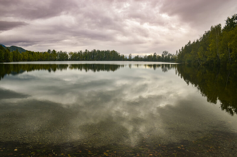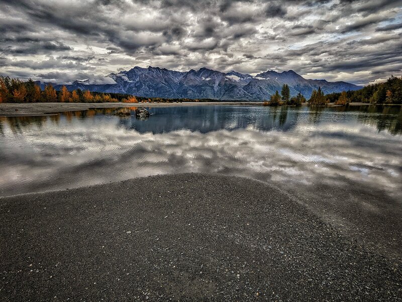 It's in the lower Knik River valley, not far from where the Knik and the Matanuska flow into the Knik Arm of the Cook Inlet (followed a little downstream by the Eklutna and Eagle rivers). The clarity of the water and the ability to see the bottom provide a n interesting contrast to the sky.
