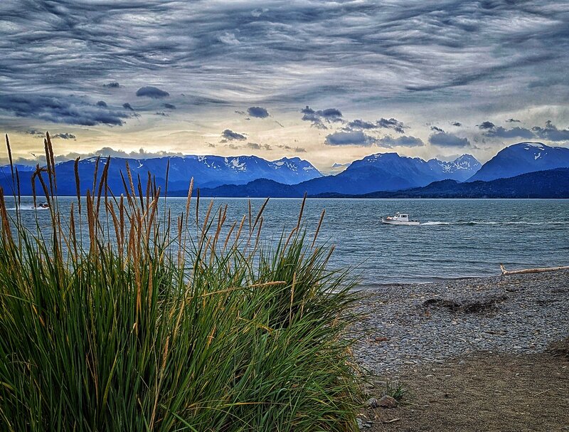 This is the heart of one of the most famous fishing grounds in the world. Land's End, the southern tip of the Homer Spit, boats of the Homer halibut fishing fleet on the water. The great glacier-carved and glacier-covered peaks of the southern Kenai on the other side of Kachemak Bay.