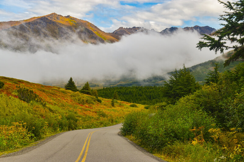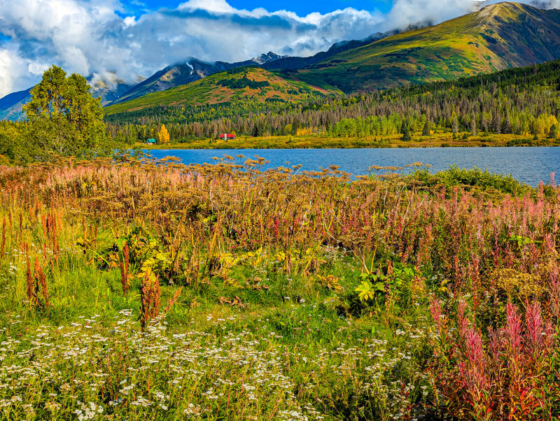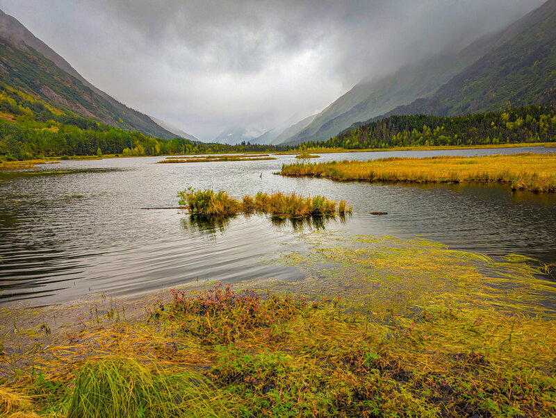 The northern entrance to the Kenai Peninsula starts at the end of the Turnagain Arm and rises through Turnagain Pass. On the Kenai side the pass are a couple of summit lakes. Here's one of them. In the Pacific Northwest, this is considered a bright, cheerful, sunny day. And so it is...