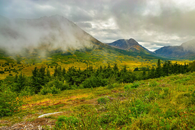 In the headwaters of the Kenai River, the view southeast toward Seward and Resurrection Bay. To the right is the long run down the Kenai River to the west coast of the Peninsula. The scale of U-shaped valley, the peaks on either side once again overwhelm, the moment calm, but anticipatory...
