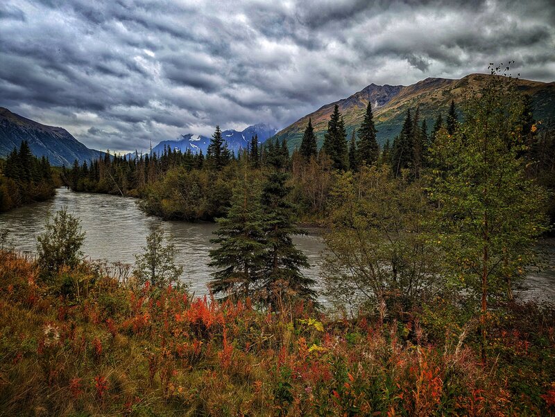 Just like everything else in the 49th state, the scale is outsized, beggars the imagination.... The Knik River valley is a mere 25 miles long, but incredibly broad in it's U-shaped space. The braided river, chalky green from the glacial silt, moves back-and-forth across the outsized valley, below the outsized peaks, under the outsized sky...