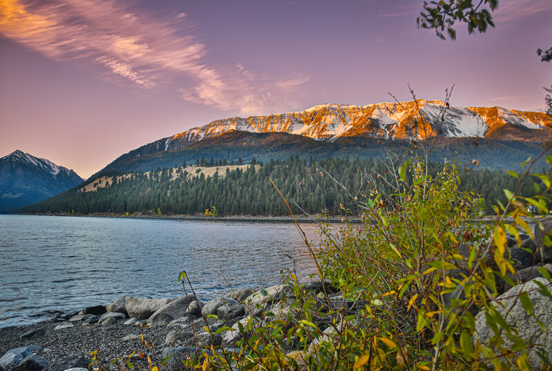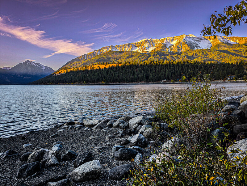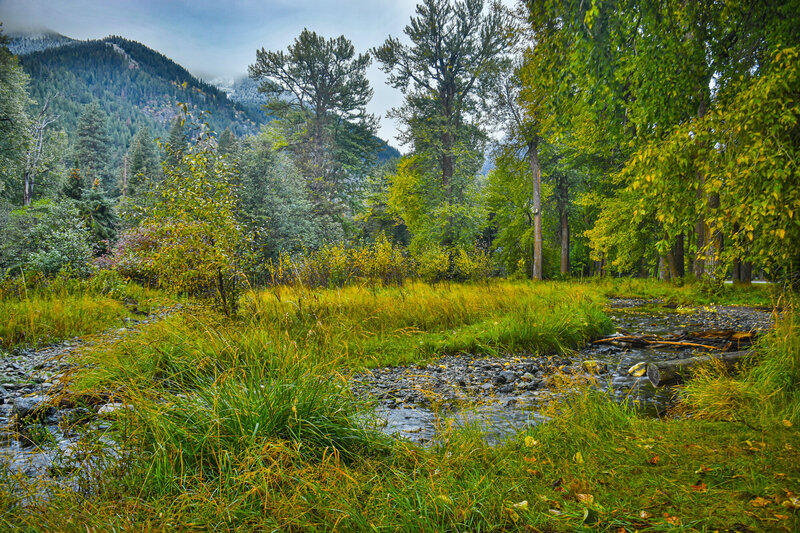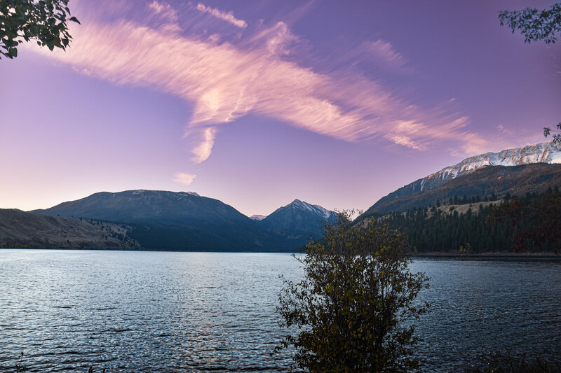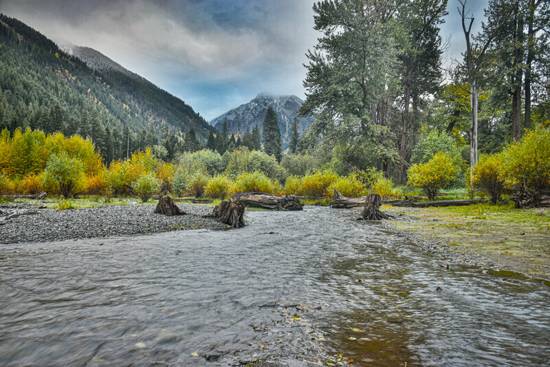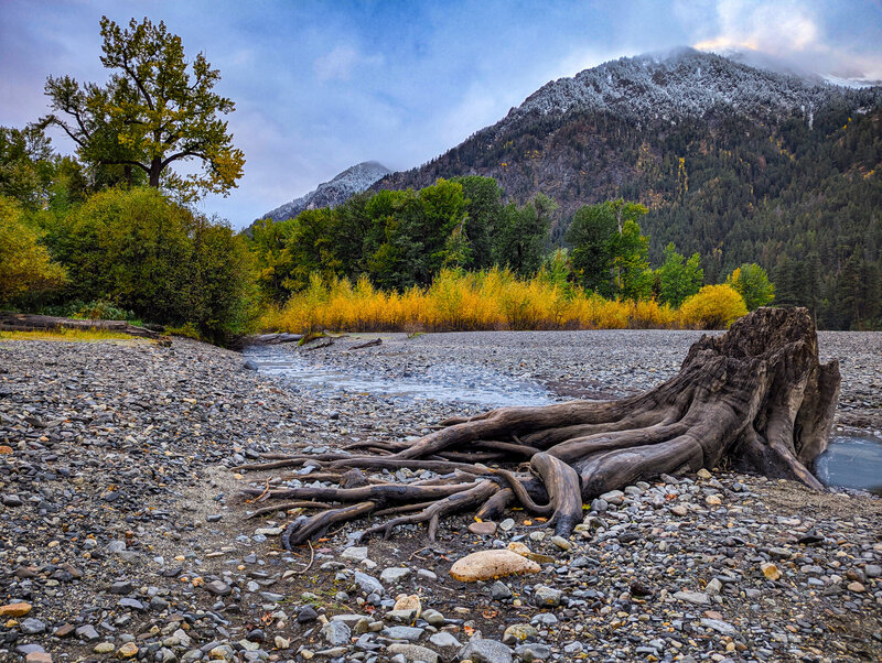 The Wallowa River starts at the confluence of the east and west forks high in the southern part of the mountain range, it then flows north into Wallowa lake. I'm standing just south of the lake, taking in the morning light and last night's dusting of snow on the peaks.