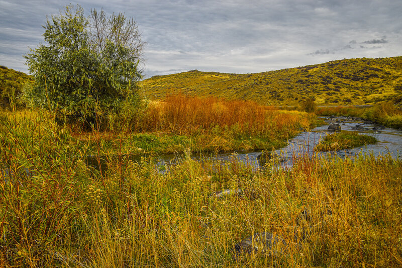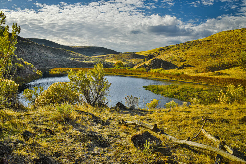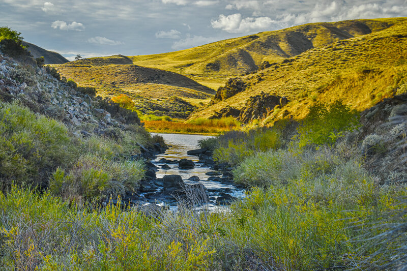 The Powder rises far to the west in the high coniferous forests of the Blue Mountains. Approaching the Snake it runs through a completely different landscape. The hills are rounded, the colors muted; here softened and textured by the late afternoon sun.